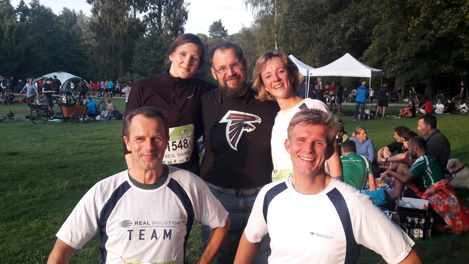 Pünktlich um 17.30 Uhr fiel der Startschuss. Nachdem das Team nun aus nur 4 Läufern/innen bestand, war besondere Kondition gefragt. Es mussten „Doppelstints“ gelaufen werden um die Kilometer des fehlenden fünften Teammitglieds auszugleichen. Aber auch das und der zwischenzeitliche Nieselregen taten der Stimmung keinen Abbruch. Um 19.49 Uhr überquerte das REAL Solution Quartett erschöpft, aber gemeinsam und glücklich die Ziellinie. Die Sportler freuten sich im Anschluss über einen prall gefüllten Picknick-Korb, der zur Stärkung an alle Teams ausgegeben wurde.