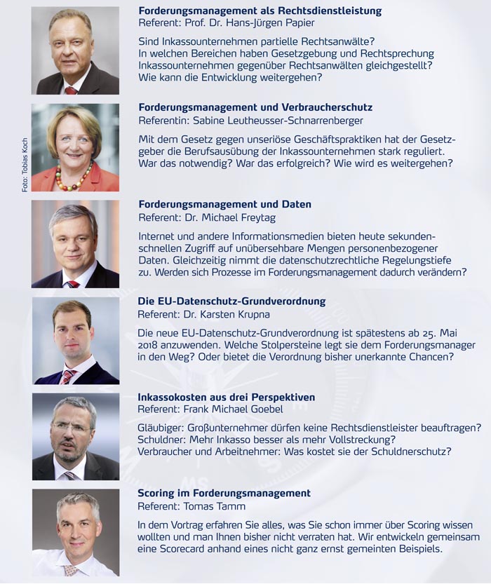 Für diesen Kongress konnten namhafte Redner gewonnen werden. So wird Prof. Dr. Dres. Hans-Jürgen Papier, früherer Präsident des Bundesverfassungsgerichts, das Forderungsmanagement als Rechtsdienstleistung bewerten und insbesondere das Verhältnis von Inkassounternehmen und Rechtsanwälten auch für die Zukunft beleuchten. Die ehemalige Bundesjustizministerin Sabine Leutheusser- Schnarrenberger wird das Forderungsmanagement aus dem Blickpunkt Verbraucherschutz und Forderungsmanagement betrachten und die Auswirkung der Regulierung durch das Gesetz gegen unseriöse Geschäftspraktiken bewerten.