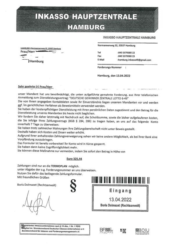 Seit einiger Zeit werden angebliche Schuldner von einer Firma, die sich „Inkasso Hauptzentrale Hamburg“ nennt, angeschrieben. Diese werden aufgefordert, frei erfundene und angeblich offene Rechnungsbeträge („Deutsche Gewinner Zentrale Lotto 6-49“) zu begleichen.